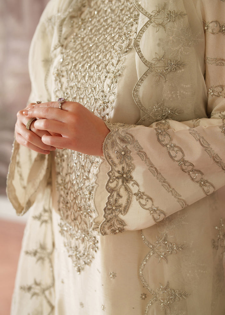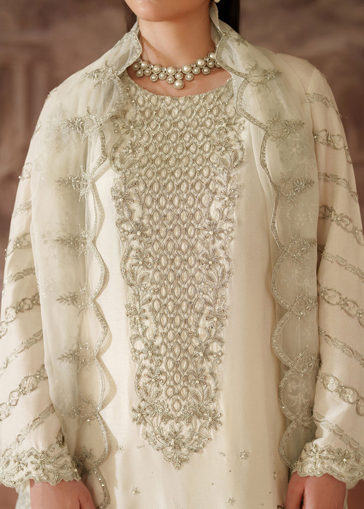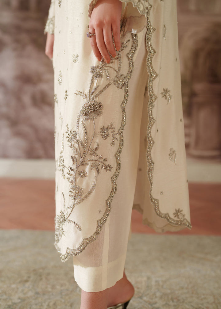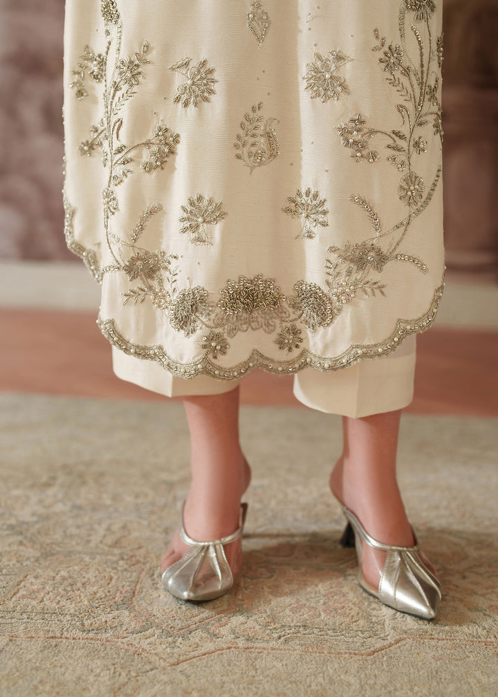 - Shirt: An Ivory Korean Raw Silk long shirt with scalloped hem border. It's embroidered with silver tilla & sequins & further enhanced with hand embellished work on neckline, sleeves, Centre & Hem border using Sitara, Baithki & Pearls.