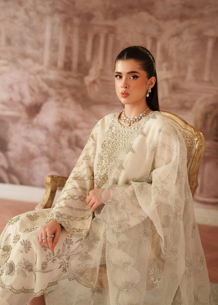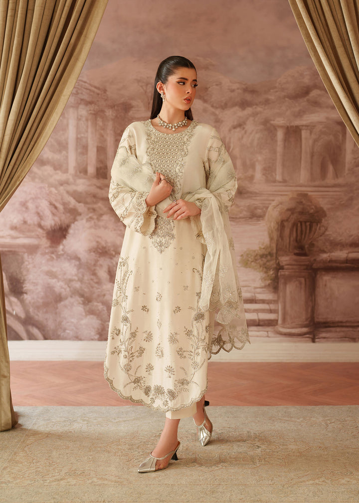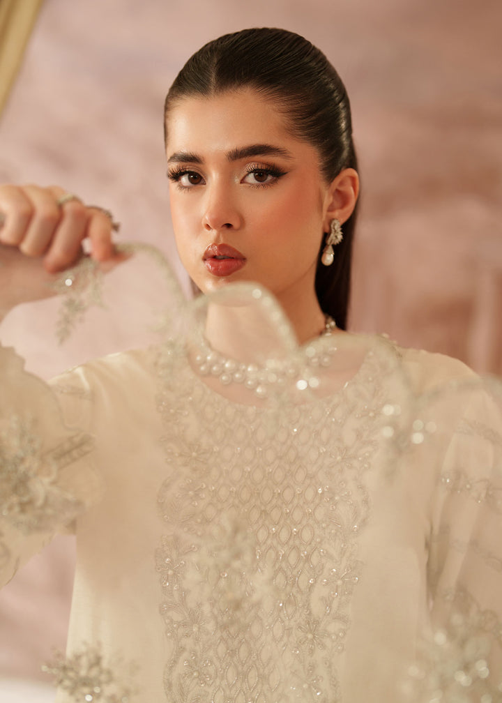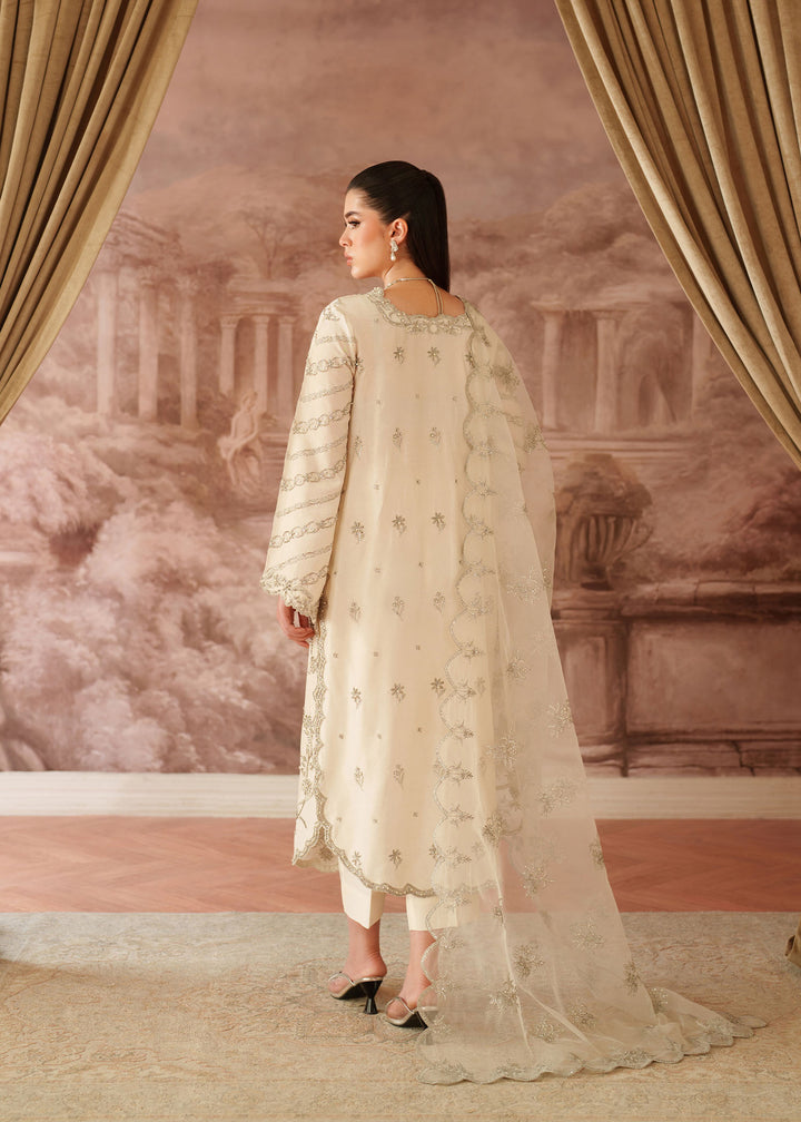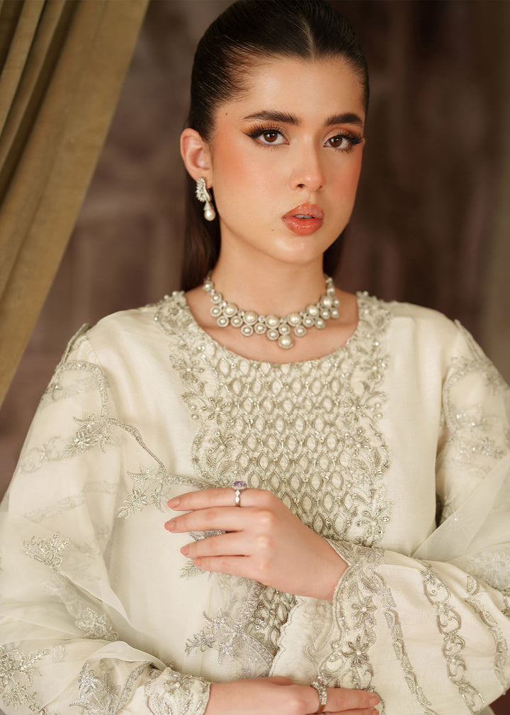 - Shirt: An Ivory Korean Raw Silk long shirt with scalloped hem border. It's embroidered with silver tilla & sequins & further enhanced with hand embellished work on neckline, sleeves, Centre & Hem border using Sitara, Baithki & Pearls.