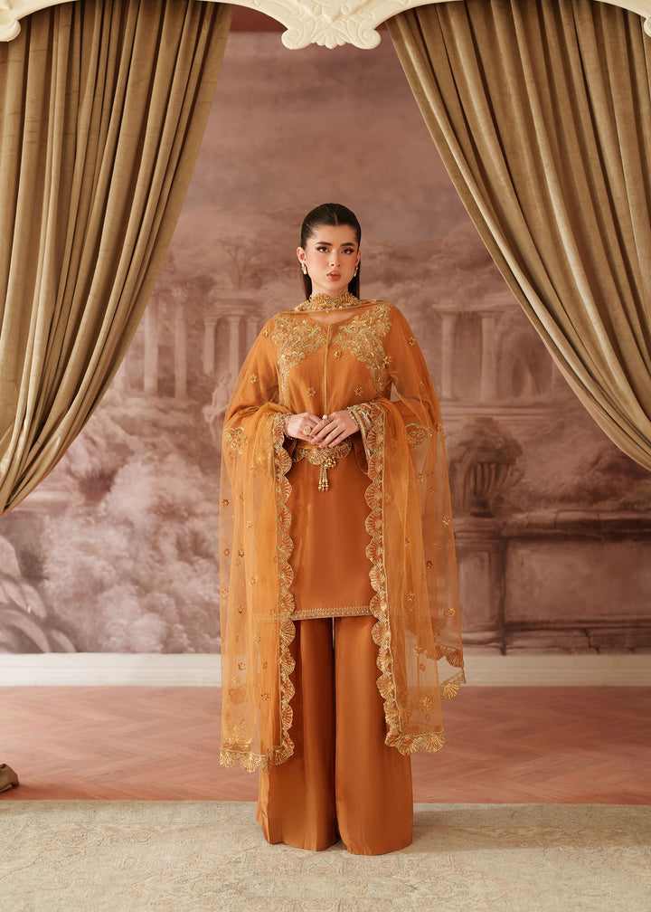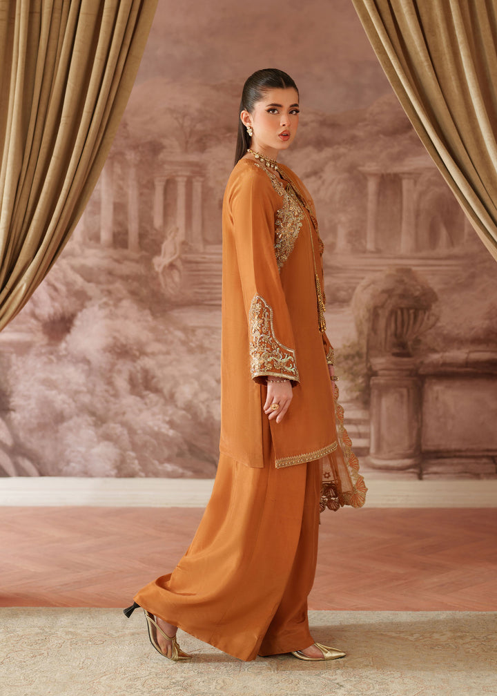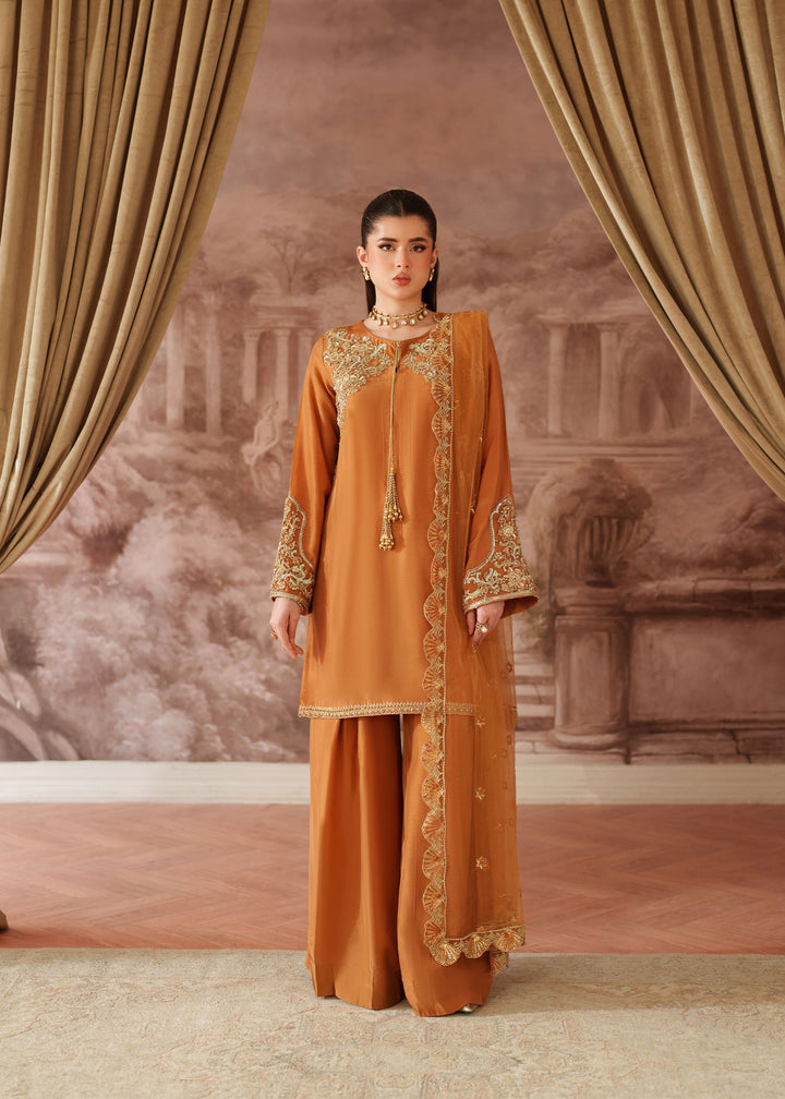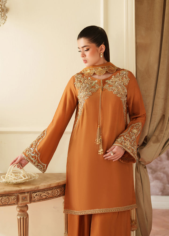 Shirt: A Gold tussel silk short shirt with embroidery using tilla & sequins on shoulders & sleeves. It's further elevated with hand embellished work using Sitara, Baithki, Crystals & Pipe. Additionally the shirt also has embellished tassels.