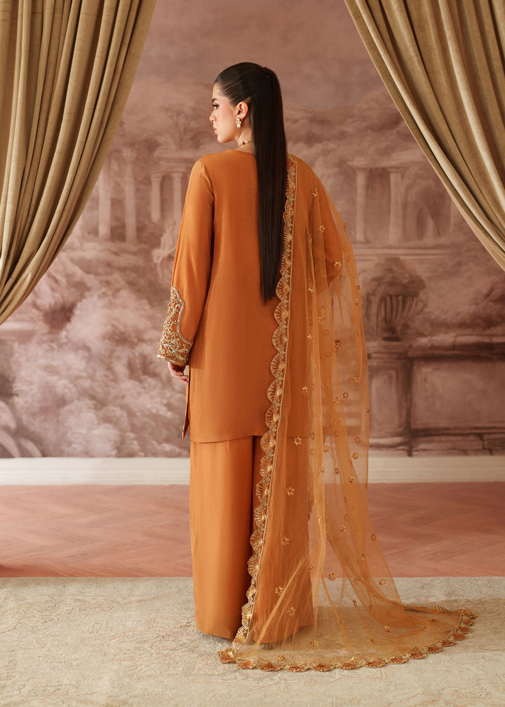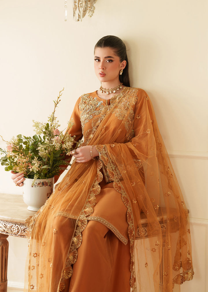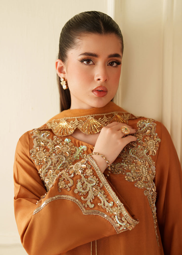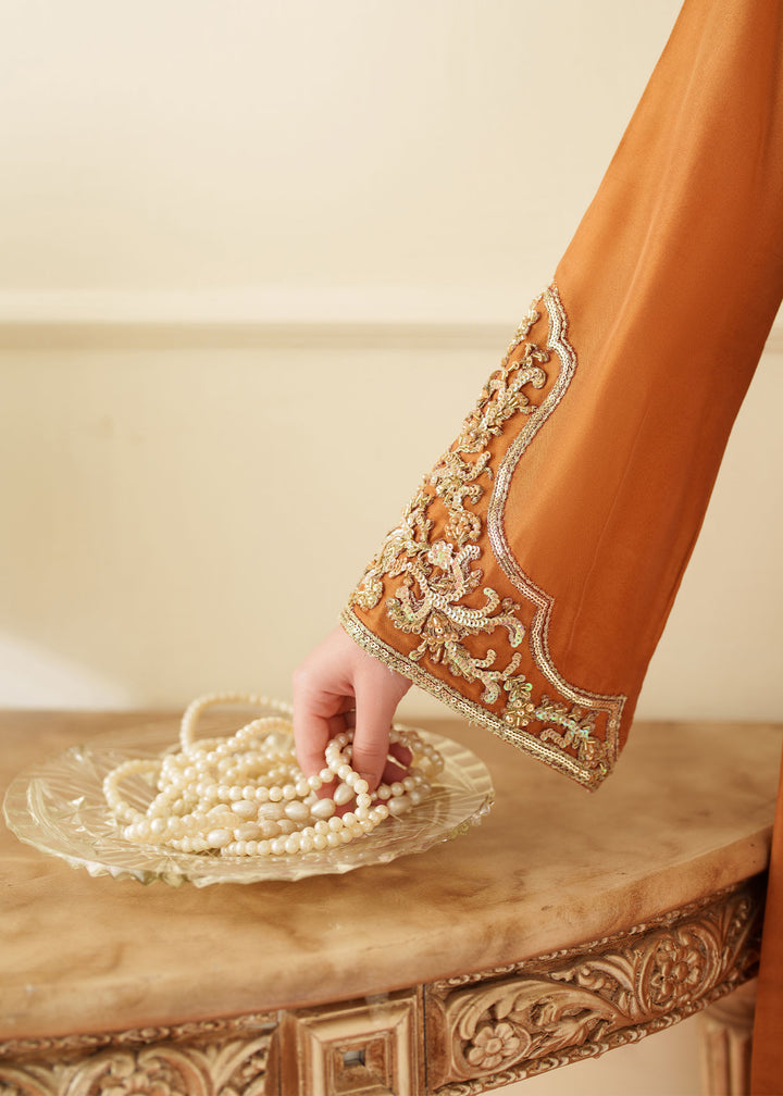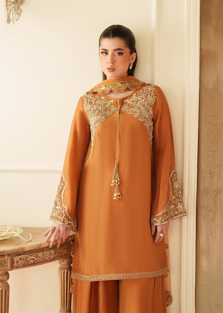 Shirt: A Gold tussel silk short shirt with embroidery using tilla & sequins on shoulders & sleeves. It's further elevated with hand embellished work using Sitara, Baithki, Crystals & Pipe. Additionally the shirt also has embellished tassels.