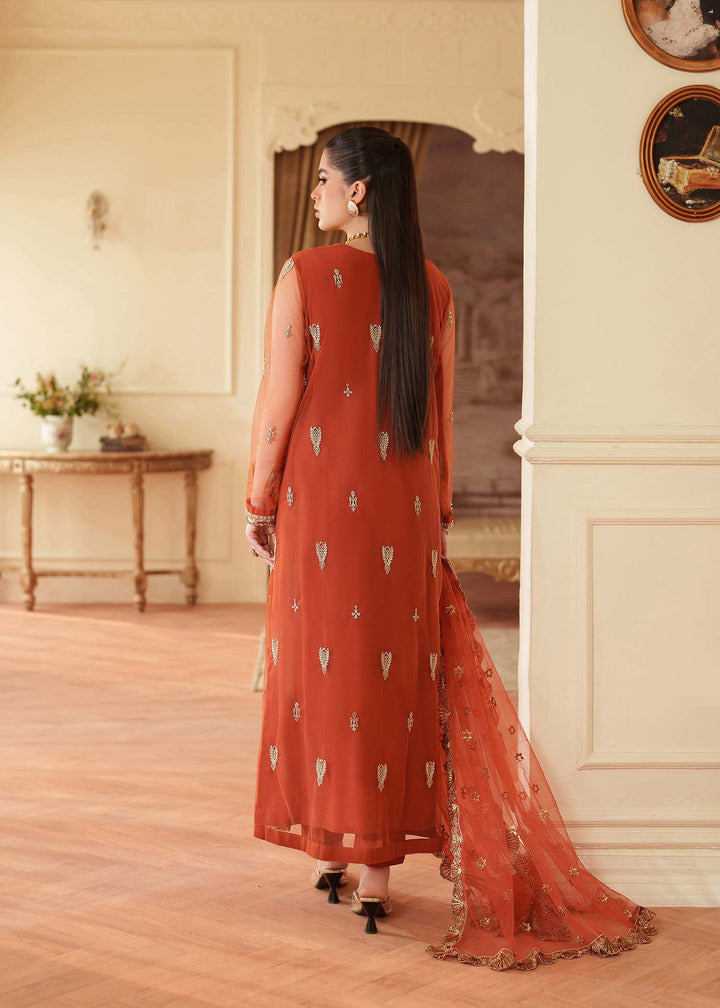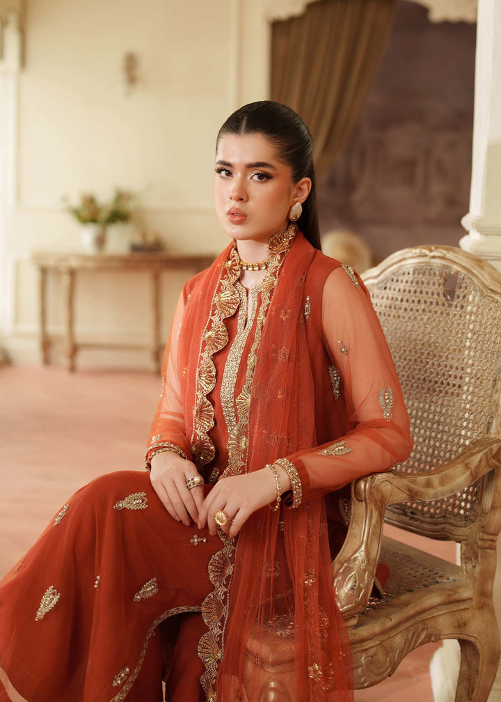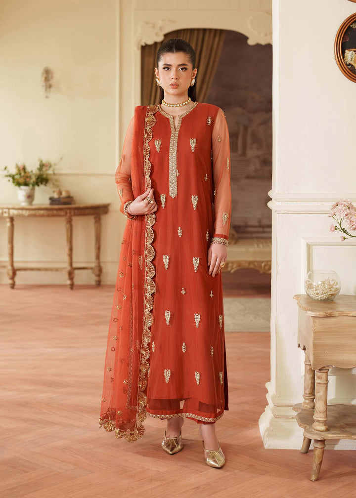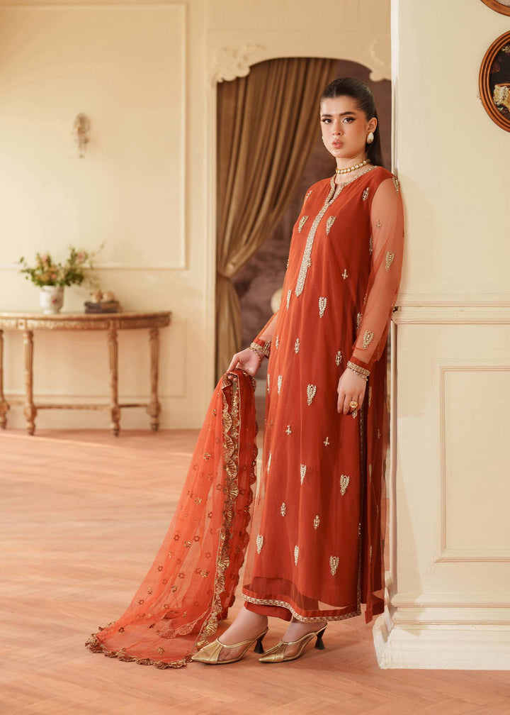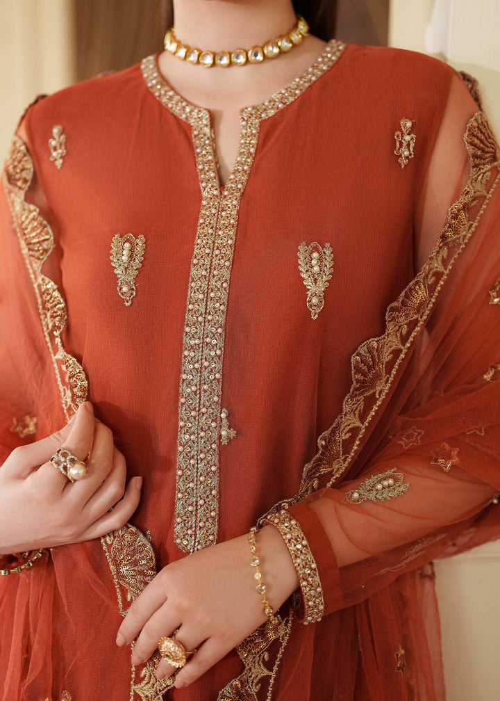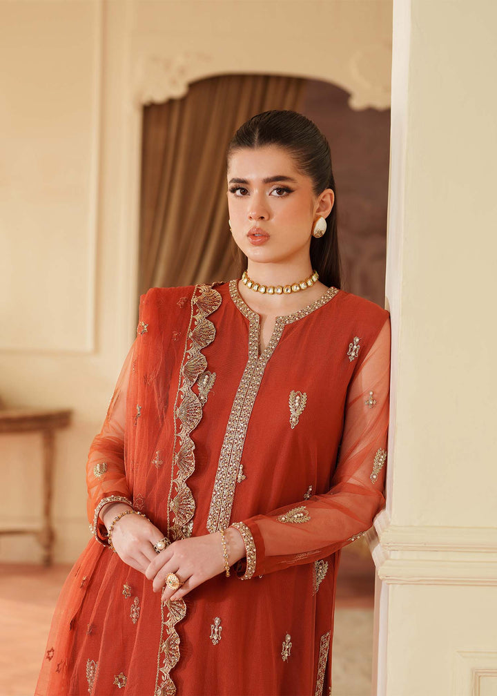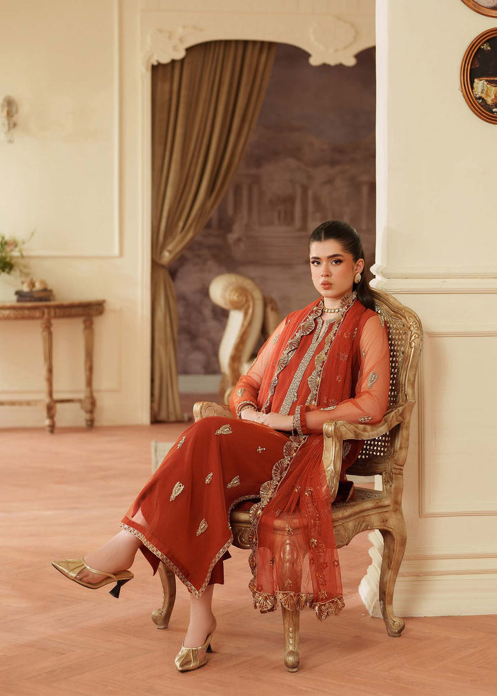 - Shirt: Rust long net shirt with Cotton silk lining. It has embroidery using tilla thread & further enhanced with hand embellished work using Baithki & Pearls.