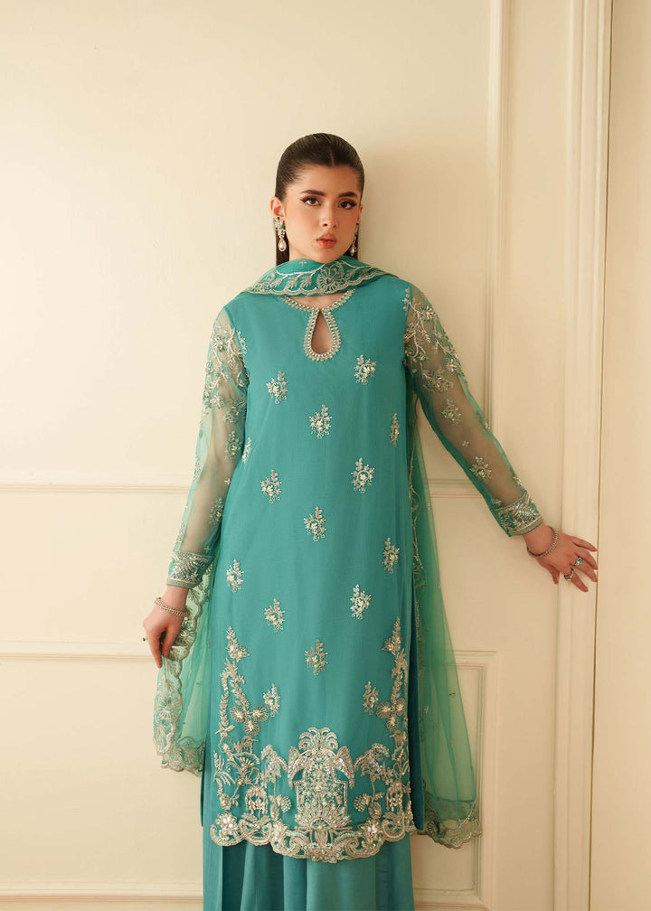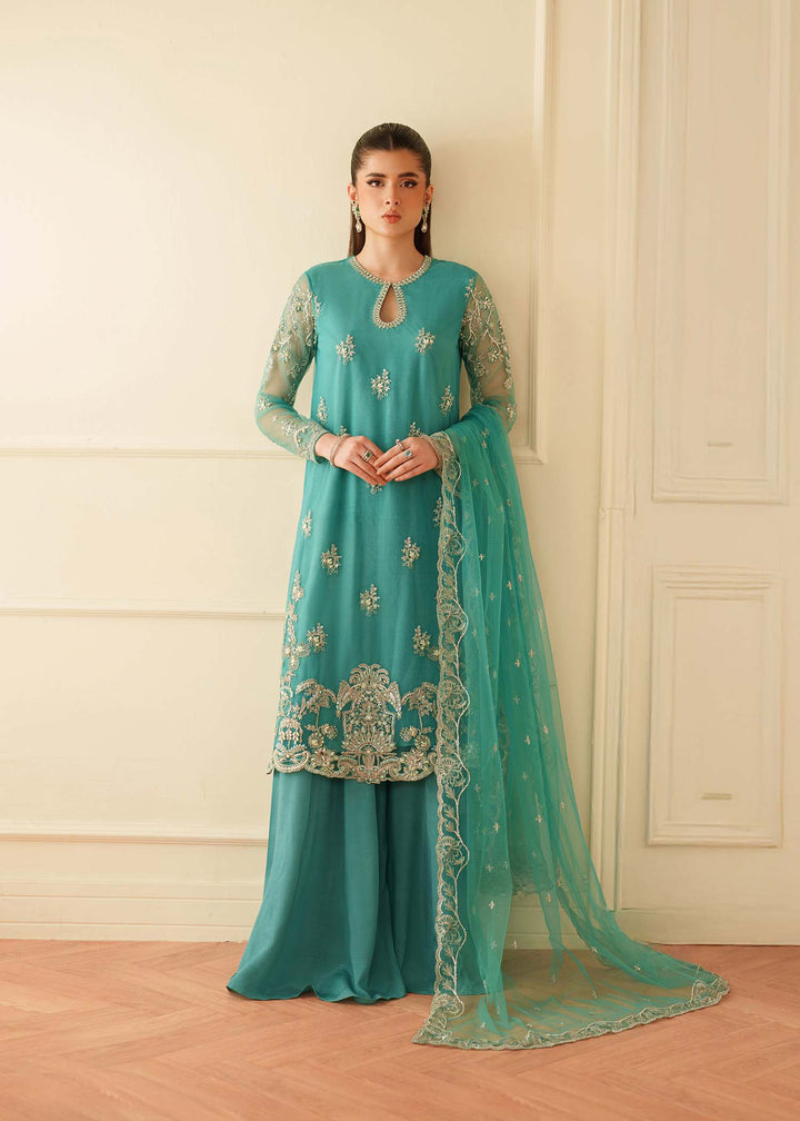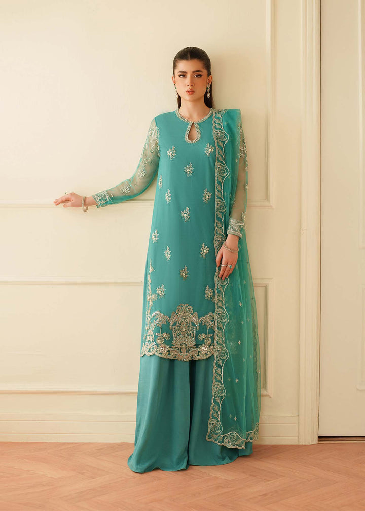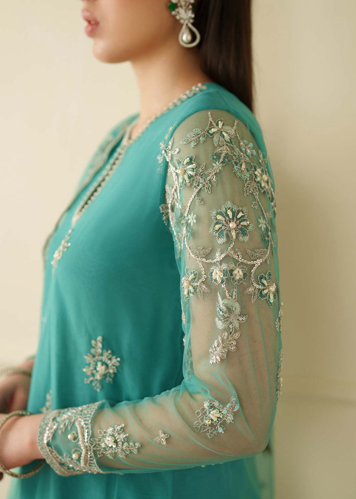 Shirt: An opulent turquoise net shirt with Cotton silk lining. It has keyhole neckline with embroidery using silver tilla thread & further enhanced with hand embellished work using Pearls, Sitara, Pipe, stone.