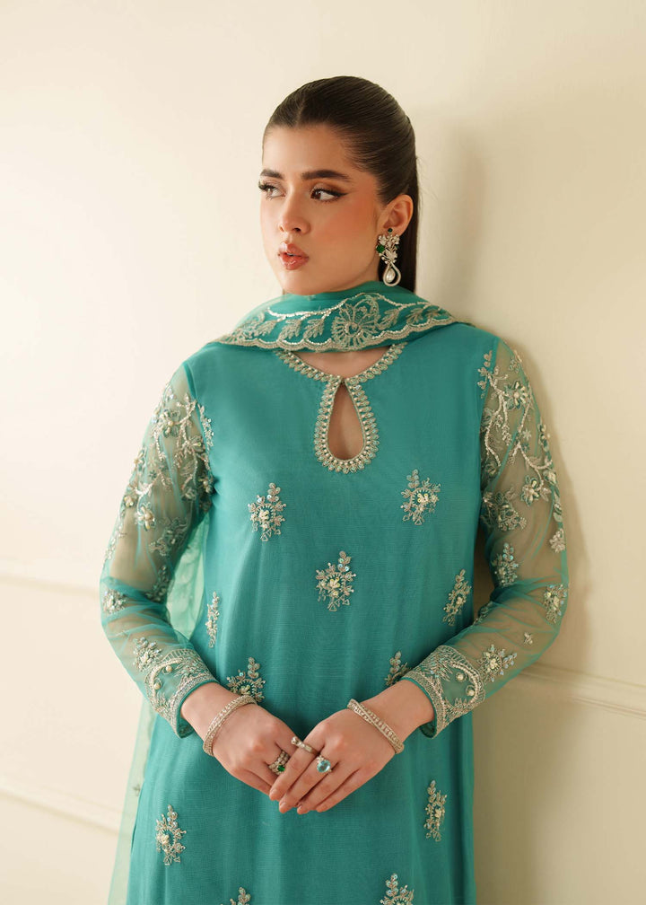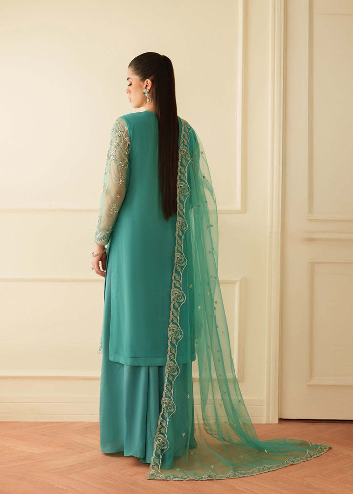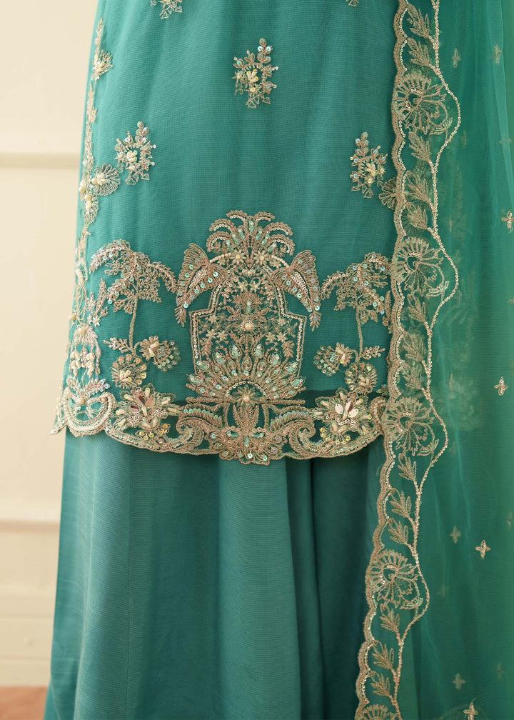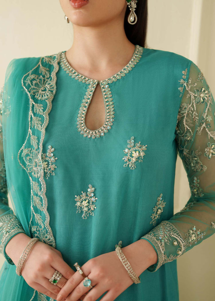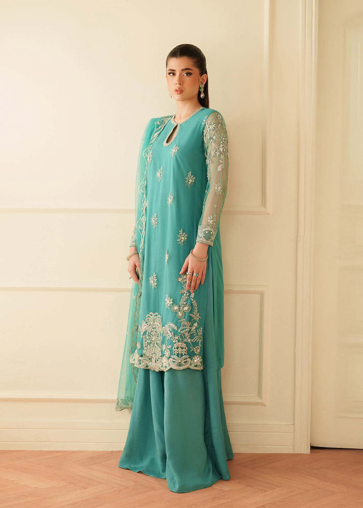 Shirt: An opulent turquoise net shirt with Cotton silk lining. It has keyhole neckline with embroidery using silver tilla thread & further enhanced with hand embellished work using Pearls, Sitara, Pipe, stone.